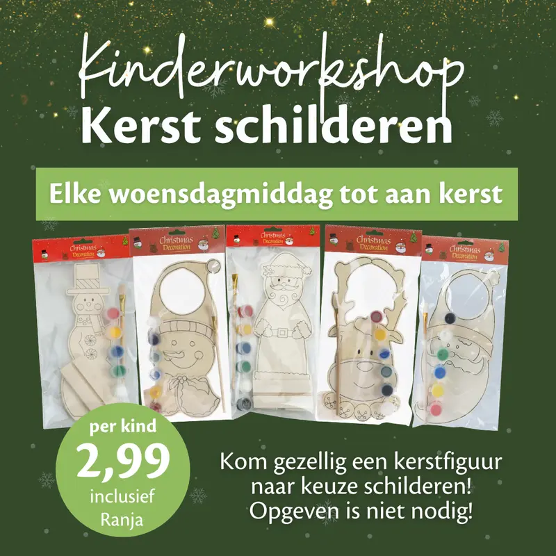 Kom gezellig langs en laat de creativiteit stromen! Tijdens deze vrolijke kidsworkshop kunnen kinderen een kerstfiguur naar keuze schilderen: van een schattig rendiertje tot een leuke sneeuwpop.