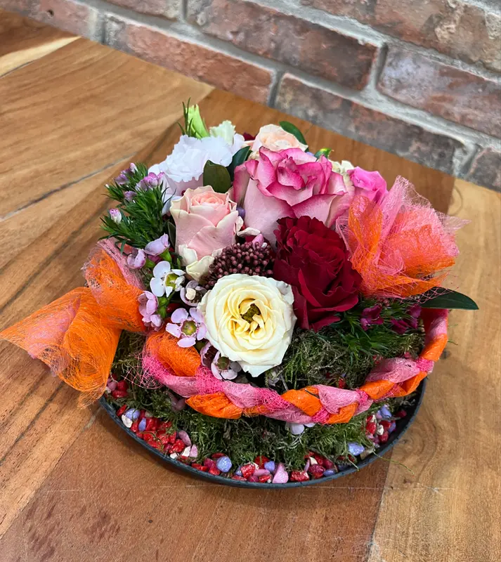 Een betoverend bloemstuk met zachte tinten en een knallend randje! 🌷