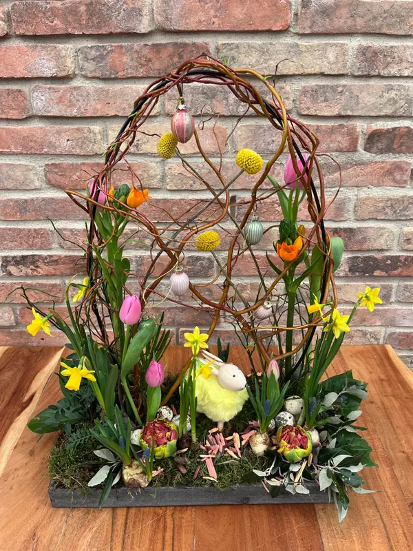 Haal het ultieme voorjaarsgevoel in huis en maak dit unieke, hoge paasplateau! Tijdens deze gezellige activiteit ga je aan de slag met een robuuste houten bak, een sfeervolle boog van decoratieve takken, verse lentebloeiers en schattige paasdetails.