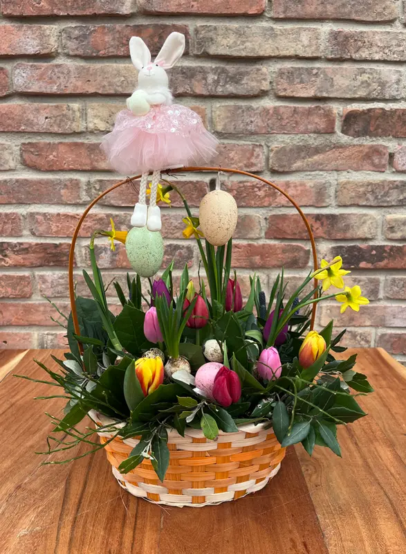 Tijdens deze creatieve activiteit ga je aan de slag met een sfeervolle gevlochten mand, een weelde aan kleurrijke lentebloeiers zoals tulpen en narcissen, speelse paaseitjes én een superleuk haasje in een tutu dat gezellig op het handvat balanceert.