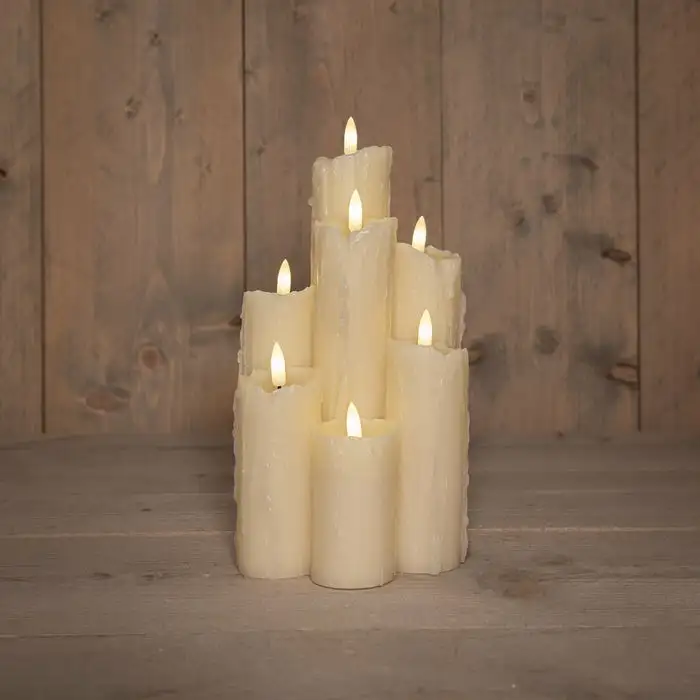 De druipkaars in ivoor met 7 LED-lichtjes en een 3D lont voegt sfeer toe aan elke ruimte. Deze kaars, met afmetingen van 15 x 25 x 15 cm, is gemaakt van was en heeft een realistische uitstraling door de druppel-effecten. De kaars werkt op 2 AA-batterijen (niet inbegrepen) en biedt een veilige alternatieve verlichting zonder open vlam. Ideaal voor een gezellige sfeer in je woonkamer of op een tafel.