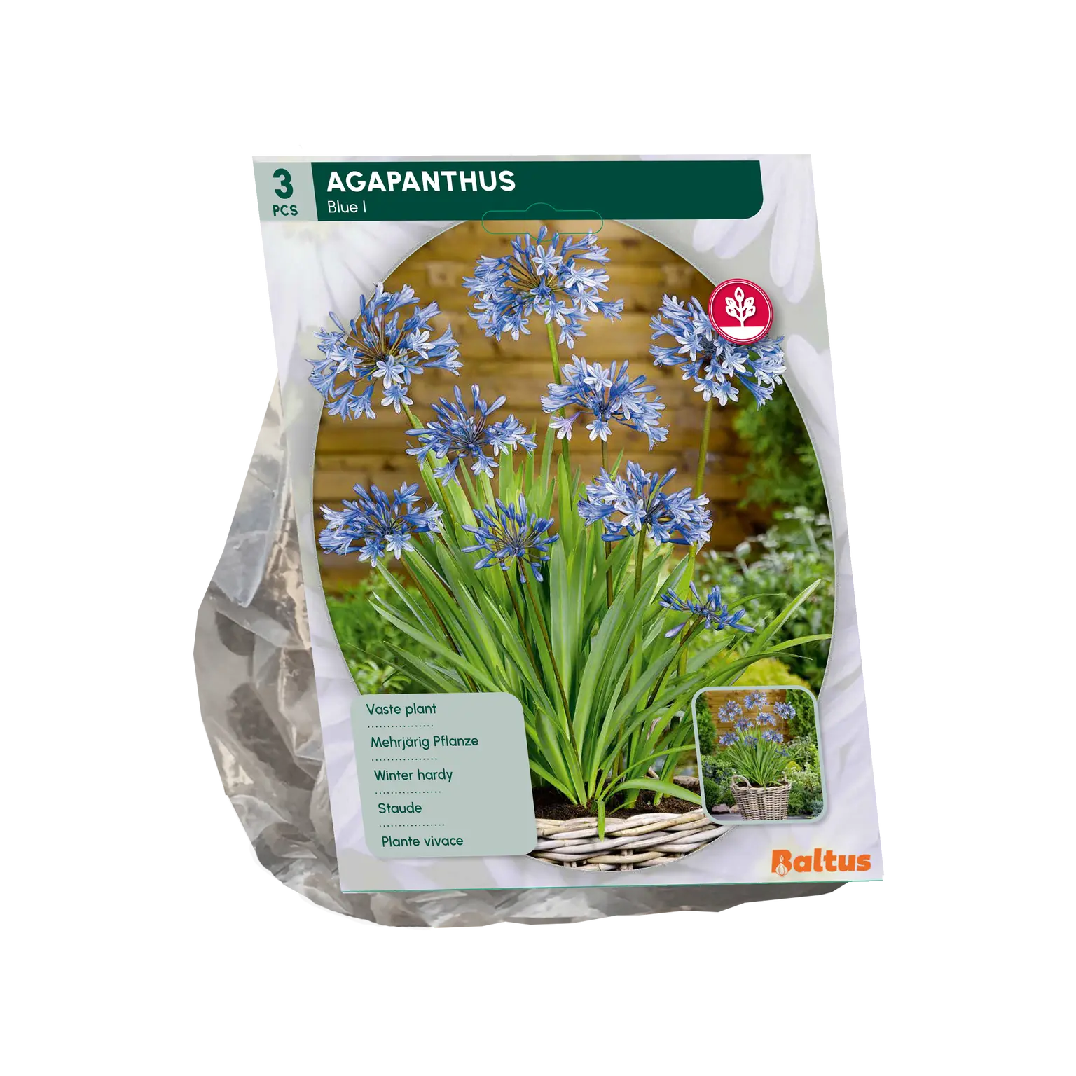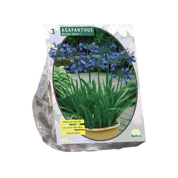 De Agapanthus is een vaste plant die in elke tuin of kuip zeker de show zal stelen. Zijn dunne, maar sterke stengels dragen prachtige trossen bloemen die sierlijk op de wind dansen. Planten van de bollen doet u vanaf april-mei in de volle grond of in een kuip. Als u er voor kiest om ze in een kuip te plaatsen, moet u er rekening mee houden dat de kuip niet veel groter dan de bol zelf mag zijn, hij moet er een beetje krap in zitten om zo de groei te bevorderen. Na de bloei het blad afsnijden en de plant met pot en al koel, droog en vorstvrij bewaren. Planten die in de volle grond staan moeten goed afgedekt worden maar kunnen daardoor wel blijven staan.