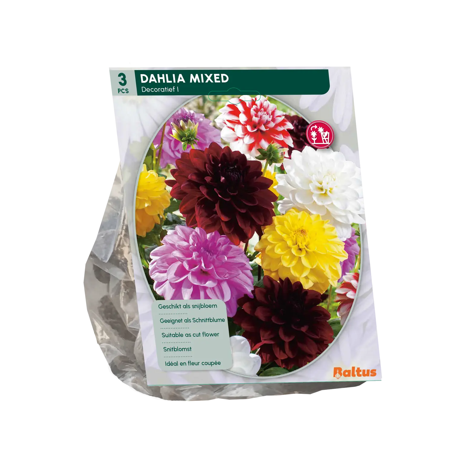 Vrolijke mix van decoratieve dahlia's. Geschikt voor potten en kuipen op het terras.Ook erg mooi als snijbloem!