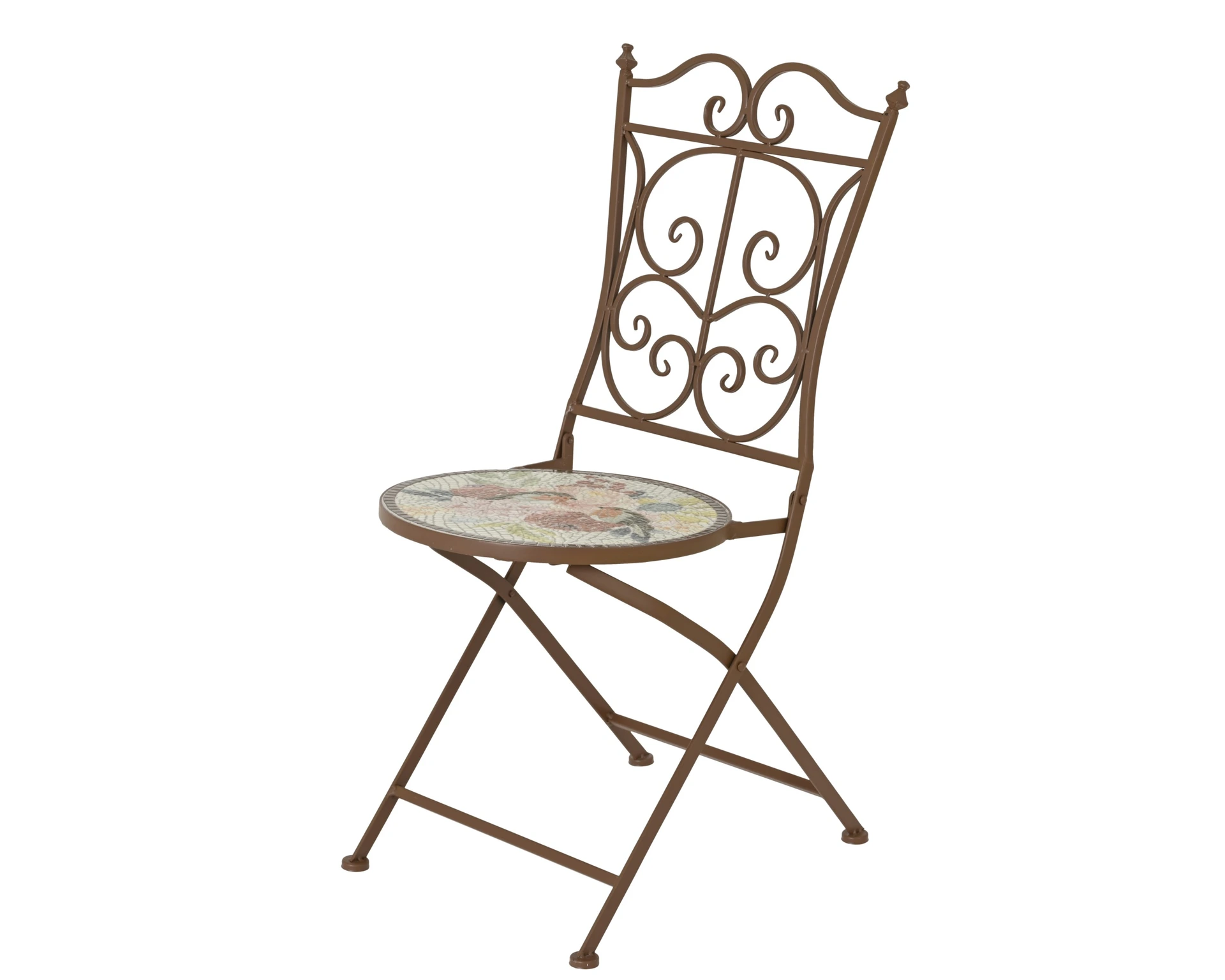Zomeravonden worden nog sfeervoller met elegante buitenmeubelen die uitnodigen om te ontspannen en te genieten. Deze bistrostoel is compact van formaat en perfect voor kleinere terrassen of balkons. Het frame is gemaakt van stevig, bruin gecoat ijzer, terwijl de zitting is voorzien van een kleurrijk stenen mozaïekpatroon. Het ontwerp combineert een classic uitstraling met praktische eigenschappen.