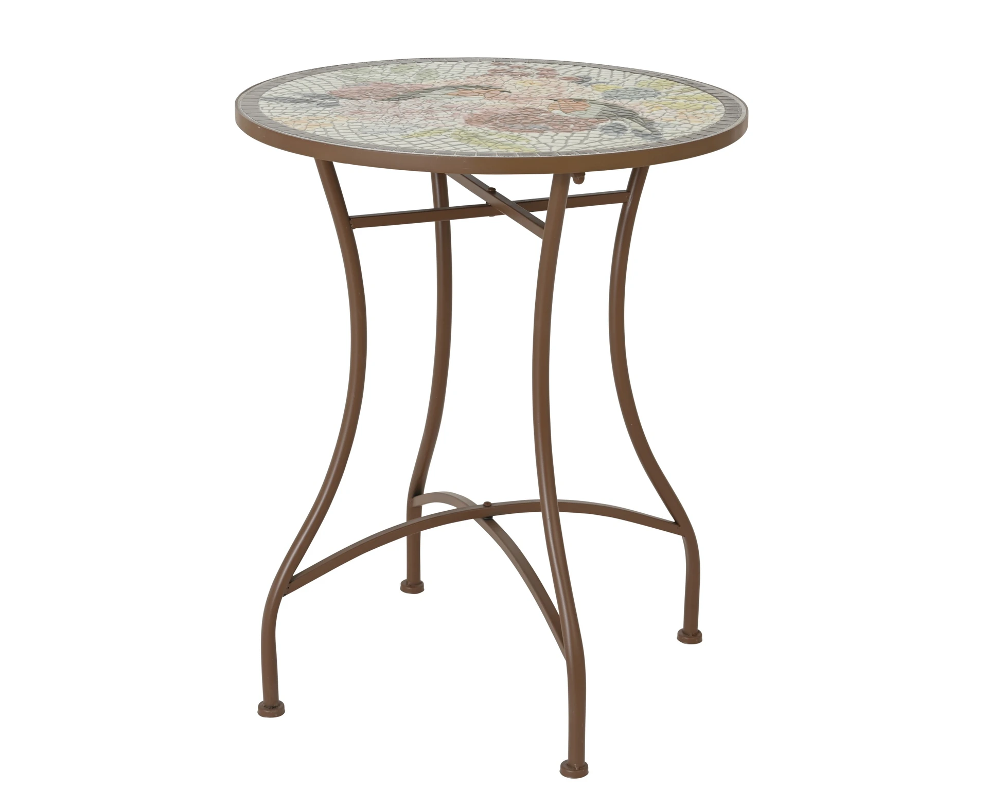 Geniet van gezellige momenten op je terras met deze sfeervolle compact bistrot tafel van Outdoor Living. Deze compacte, ronde tafel met een diameter van 58 cm en een hoogte van 71 cm is perfect voor kleine ruimtes en intieme bijeenkomsten. Het tafelblad is gemaakt van duurzaam mozaïeksteen met een levendig mozaïekpatroon, wat zorgt voor een warme, uitnodigende uitstraling. Het stevige frame van bruin geanodiseerd en gepoedercoat ijzer biedt een elegante en robuuste basis in een classic stijl.