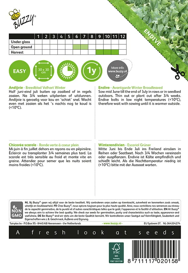 Half juni-eind juli buiten op zaaibed of in regels zaaien. Na 3/4 weken uitplanten of uitdunnen. Andijvie is gevoelig voor kou en 'schiet' snel. Wacht even met zaaien als het 's nachts nog te koud is (< 10 ).