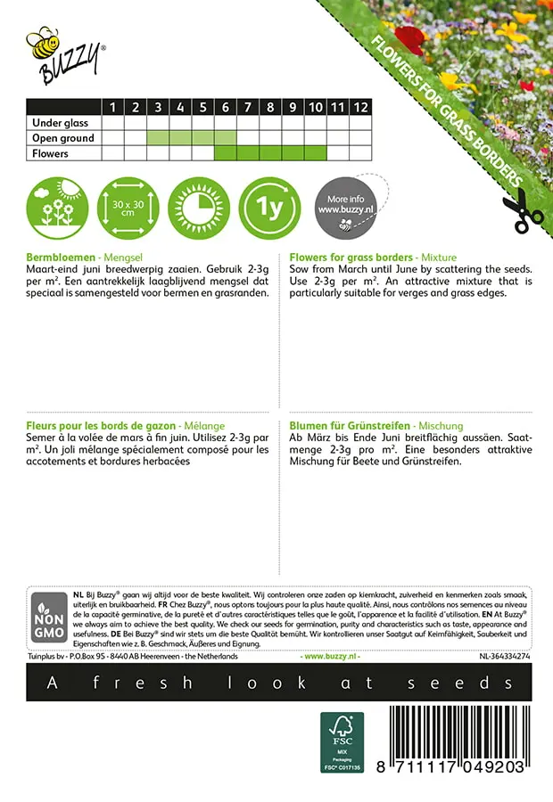 Maart-eind juni breedwerpig zaaien. Gebruik 2-3g per m². Een aantrekkelijk laagblijvend mengsel dat speciaal samengesteld is voor bermen en grasranden._x000D_