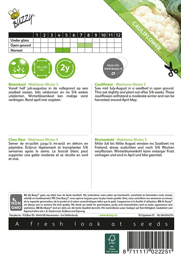 Vanaf half juli tot half augustus in de vollegrond op zaaibed, iets uitdunnen en ca. 5-6 weken later uitplanten. Winterbloemkool kan matige vorst verdragen en wordt omstreeks april-mei geoogst._x000D_
