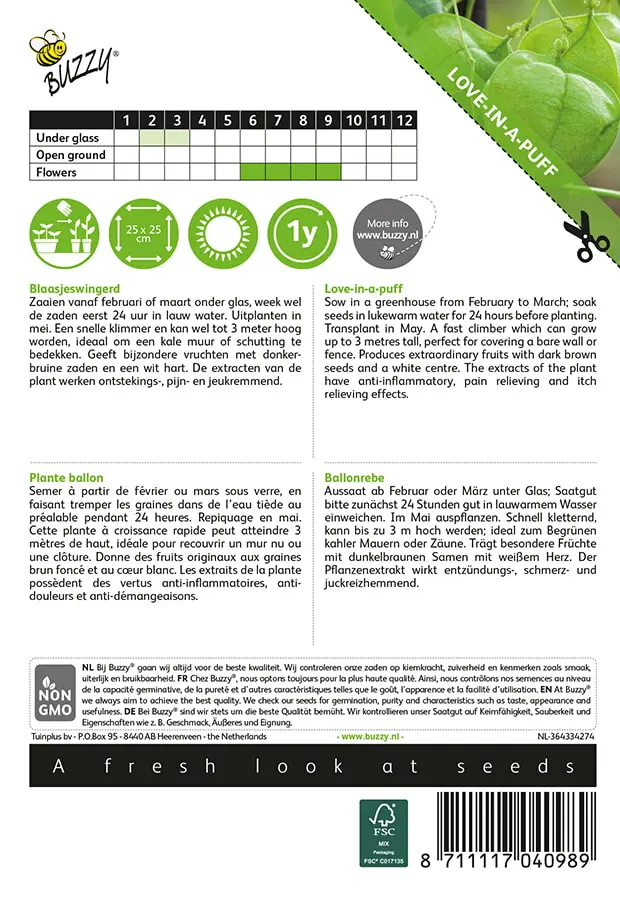 worden, ideaal om een kale muur of schutting te bedekken. Geeft bijzondere vruchten met donkerbruine zaden en een wit hart. De extracten van de plant werken ontstekings-, pijn- en jeukremmend.