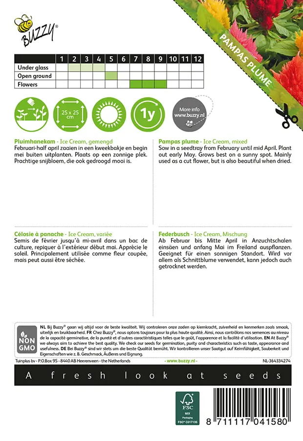 Februari-half april zaaien in een kweekbakje en begin mei buiten uitplanten. Plaats op een zonnige plek. Prachtige snijbloem, die ook gedroogd mooi is.