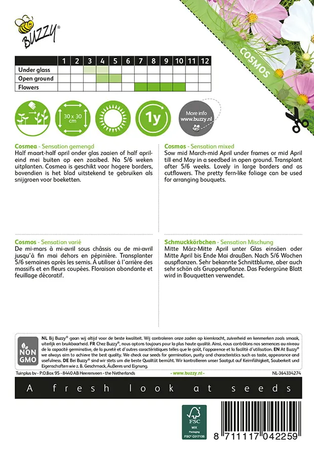 Half maart-half april onder glas zaaien of half april- eind mei buiten op een zaaibed. Na 5/6 weken uitplanten. Cosmea is geschikt voor hogere borders,_x000D_