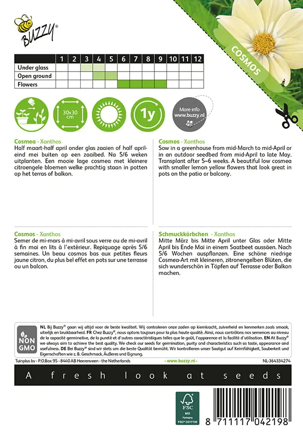 Half maart-half april onder glas zaaien of half april- eind mei buiten op een zaaibed. Na 5/6 weken uitplanten. Een mooie lage cosmea met kleinere_x000D_
