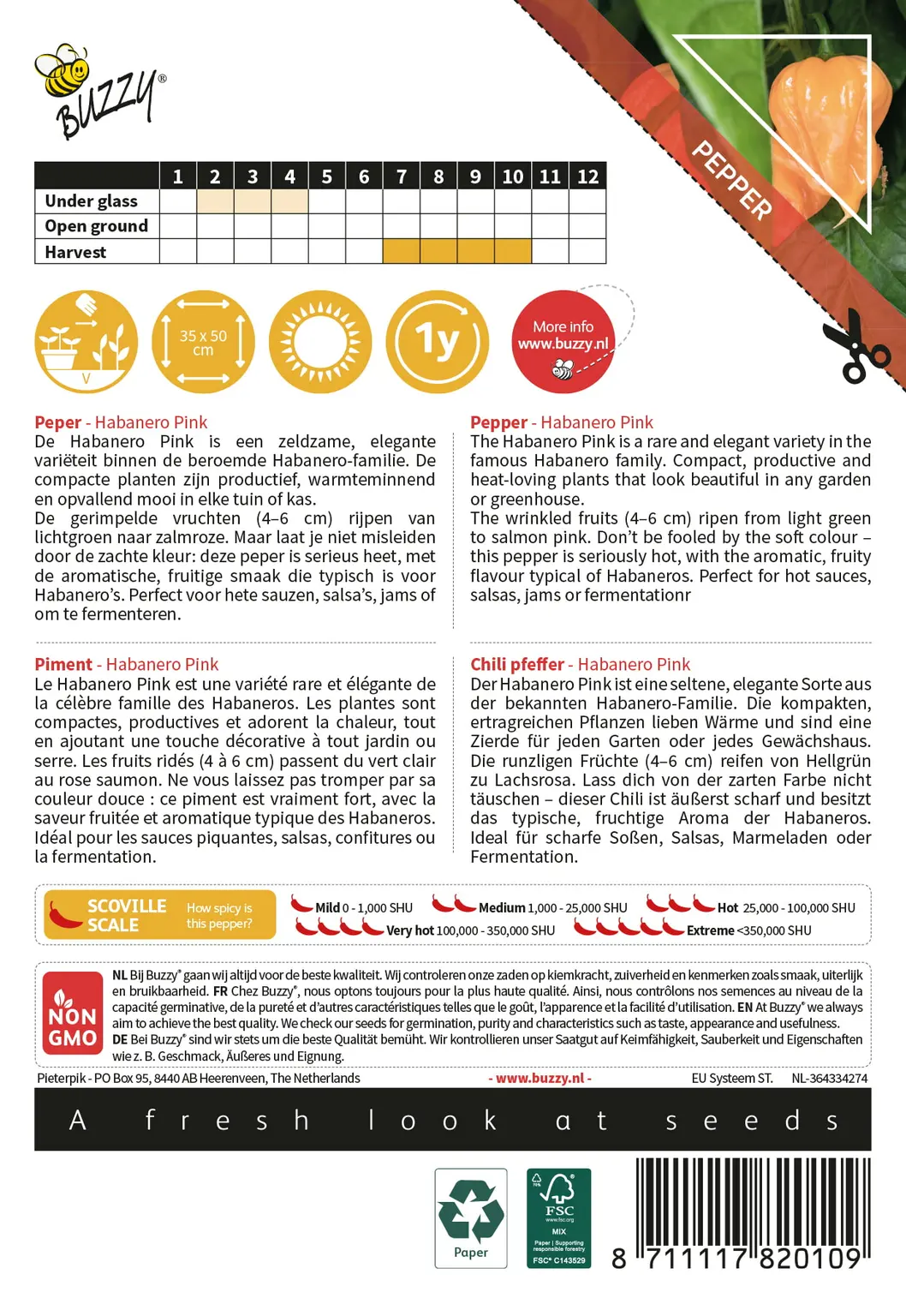 De Habanero Pink is een zeldzame, elegante variëteit binnen de beroemde Habanero-familie. De compacte planten zijn productief, warmteminnend en opvallend mooi in elke tuin of kas. De gerimpelde vruchten (4–6 cm) rijpen van lichtgroen naar zalmroze. Maar laat je niet misleiden door de zachte kleur: deze peper is serieus heet, met de aromatische, fruitige smaak die typisch is voor Habanero’s. Perfect voor hete sauzen, salsa’s, jams of om te fermenteren.