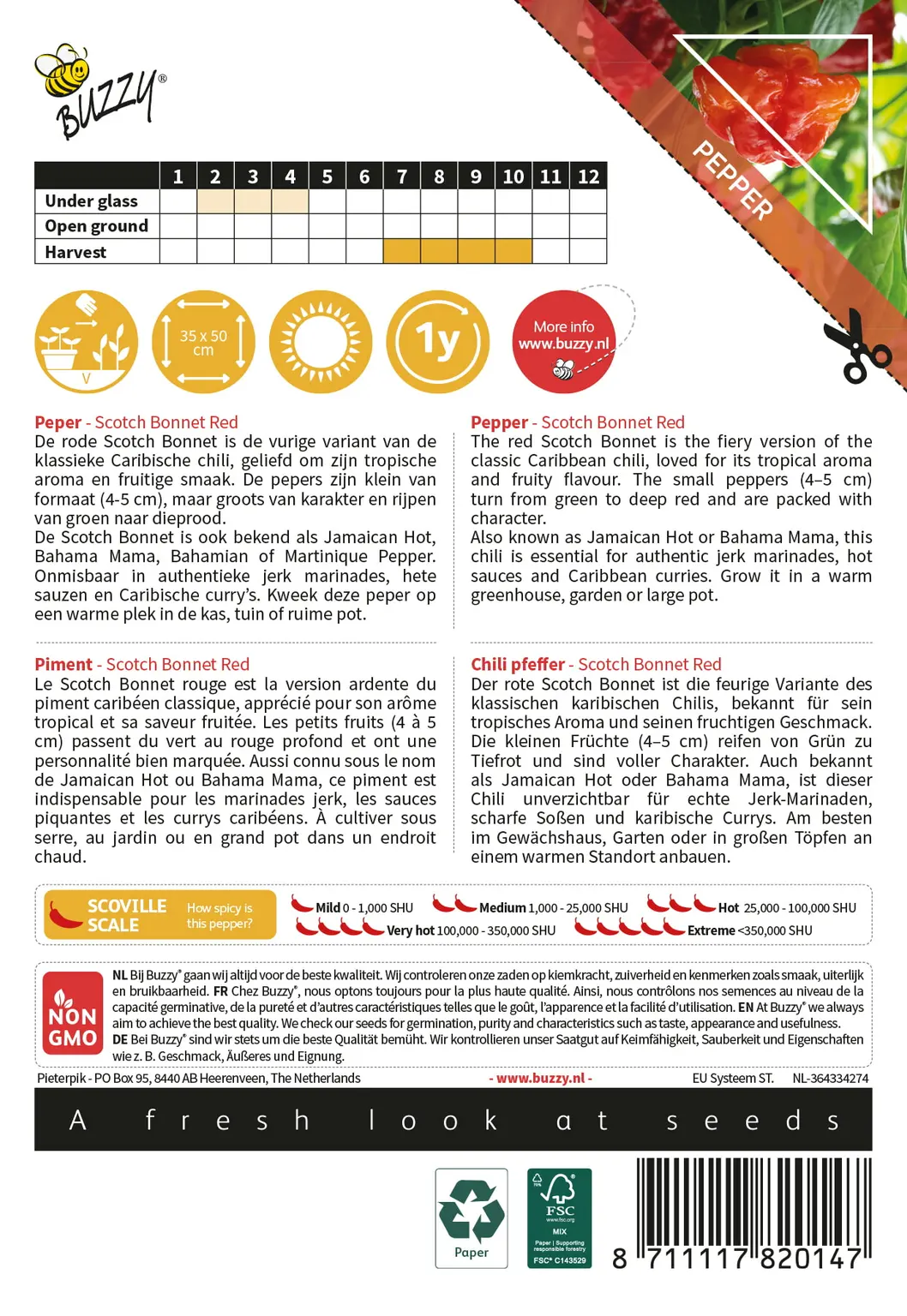 De rode Scotch Bonnet is de vurige variant van de klassieke Caribische chili, geliefd om zijn tropische aroma en fruitige smaak. De pepers zijn klein van formaat (4-5 cm), maar groots van karakter en rijpen van groen naar dieprood. De Scotch Bonnet is ook bekend als Jamaican Hot, Bahama Mama, Bahamian of Martinique Pepper. Onmisbaar in authentieke jerk marinades, hete sauzen en Caribische curry’s. Kweek deze peper op een warme plek in de kas, tuin of ruime pot.