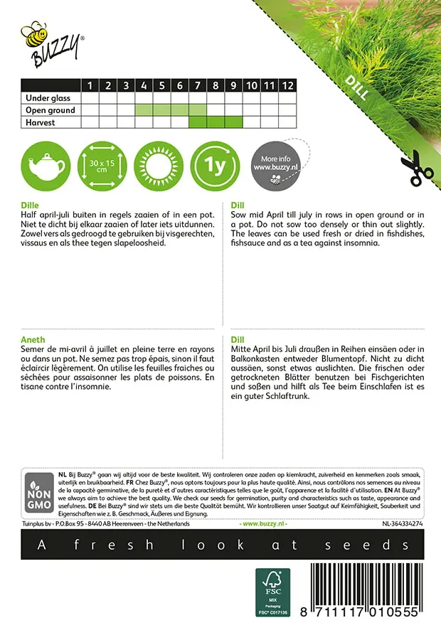dicht zaaien, anders iets uitdunnen. Zowel vers als gedroogd blad bij alle visgerechten en sauzen en als thee tegen slapeloosheid._x000D_