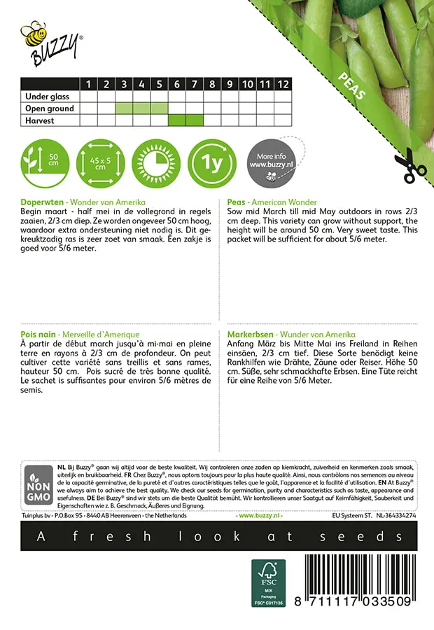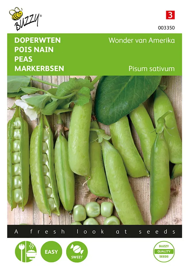 ongeveer 40 cm hoog, waardoor extra ondersteuning niet nodig is. Dit gekreuktzadig ras is zeer zoet van smaak. Een zakje is goed voor 5/6 meter._x000D_