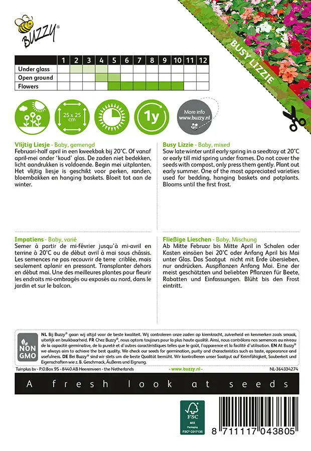 Februari-half april in een kweekbak bij 20°C. Of vanaf april-mei onder ‘koud’ glas. De zaden niet bedekken, licht aandrukken is voldoende. Begin mei uitplanten. Het vlijtig liesje is geschikt voor perken, randen, bloembakken en hanging baskets. Bloeit tot aan de winter.