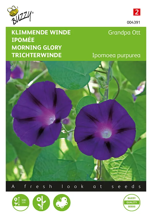 Maart-eind april onder glas zaaien. Na 5/6 weken uitplanten. De Grandpa Ott is een snelgroeiende hoge klimplant, ideaal voor een schutting en muur. Trekt veel vlinders aan._x000D_