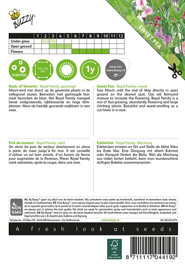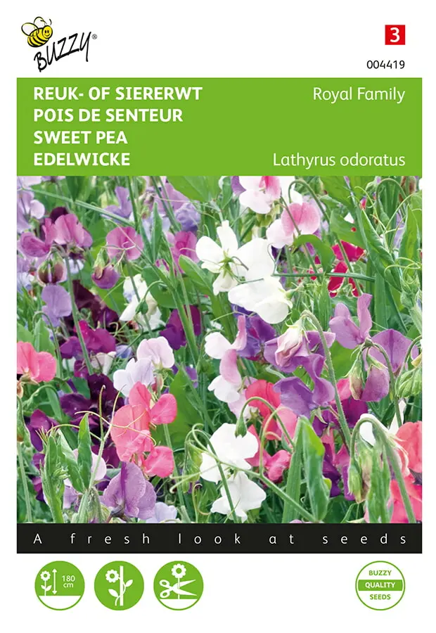 Maart-eind mei direct op de gewenste plaats in de vollegrond zaaien. Bemesten met gedroogde koemest bevordert de bloei. Het Royal Family mengsel bevat snelgroeiende, rijkbloeiende en hoge klimplanten. Mooi als heerlijk geurende snijbloem in een vaas._x000D_
