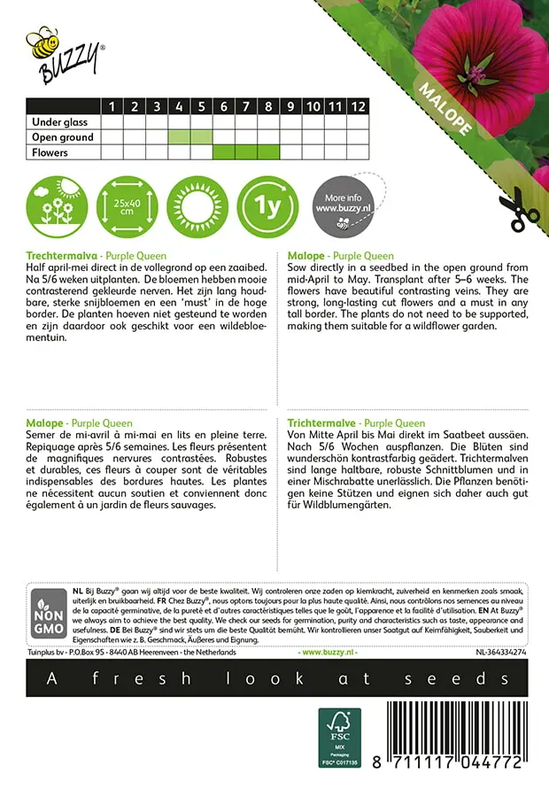 Half april-mei direct in de vollegrond op een zaaibed. Na 5/6 weken uitplanten. De bloemen hebben mooie contrasterend gekleurde nerven. Het zijn lang houdbare, sterke snijbloemen en een ‘must’ in de hoge border. De planten hoeven niet gesteund te worden en zijn daardoor ook geschikt voor een wildebloementuin.