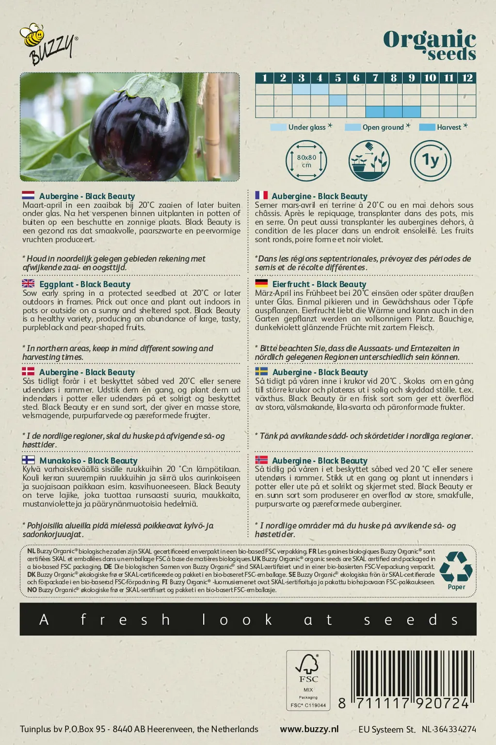 Maart-april in een zaaibak bij 20°C zaaien of later buiten onder glas. Na_x000D_ het verspenen binnen uitplanten in potten of buiten op een beschutte_x000D_ en zonnige plaats. Black Beauty is een gezond ras dat smaakvolle, paarszwarte_x000D_ en peervormige vruchten produceert._x000D_