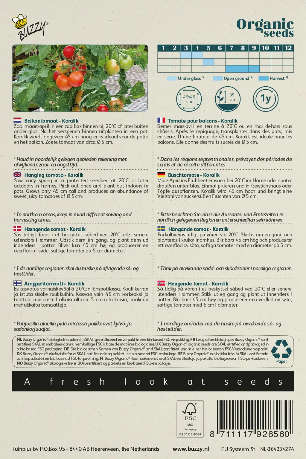 Zaai maart-april in een zaaibak binnen bij 20°C of later buiten onder glas. Na het verspenen binnen uitplanten in een pot. Koralik wordt ongeveer 45 cm hoog en is ideaal voor de patio en het balkon. Zoete tomaat van circa Ø 5 cm.