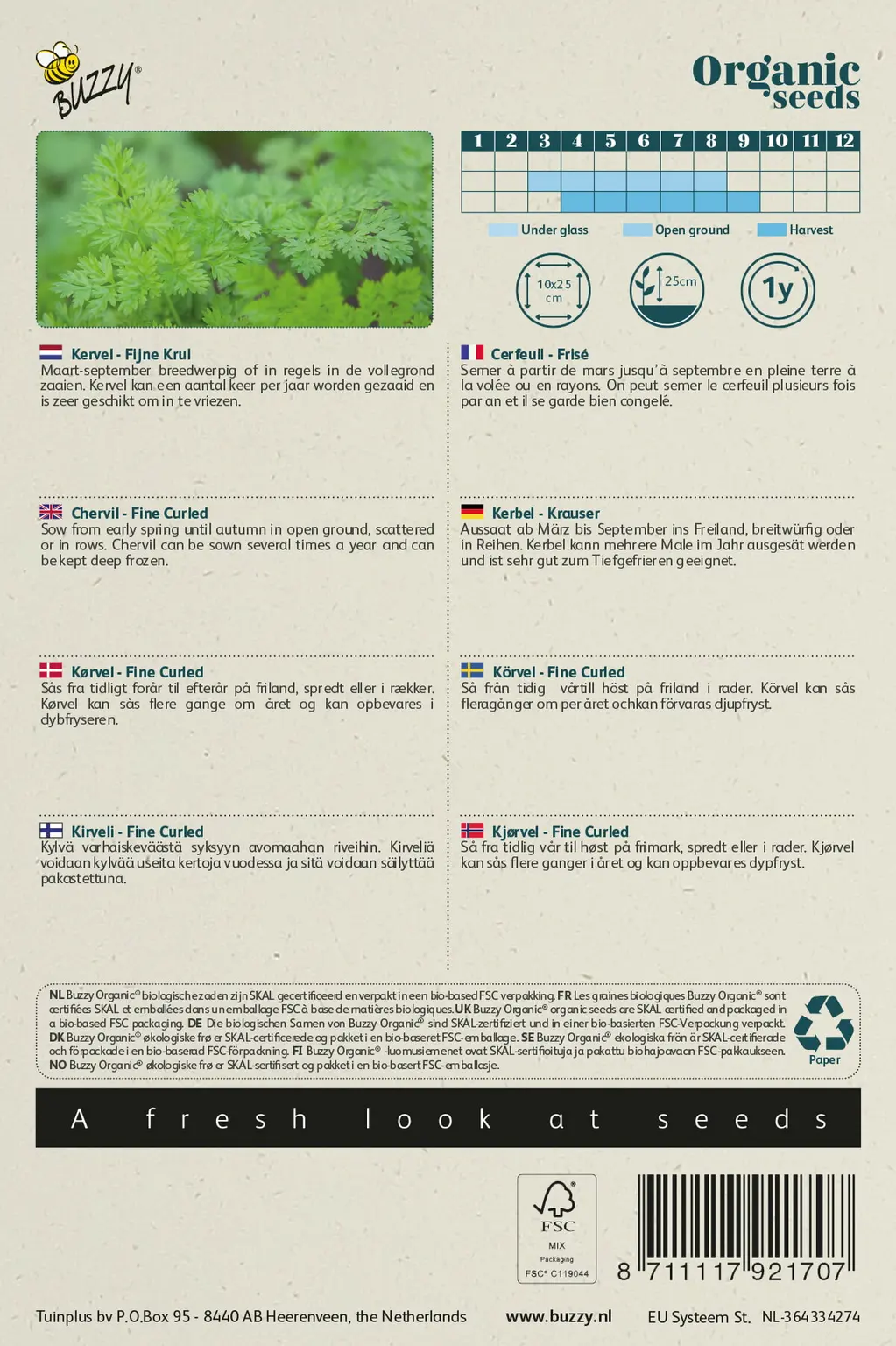 Maart-september breedwerpig of in regels in de vollegrond zaaien. Kervel kan een aantal keer per jaar worden gezaaid en is zeer geschikt om in te vriezen.
