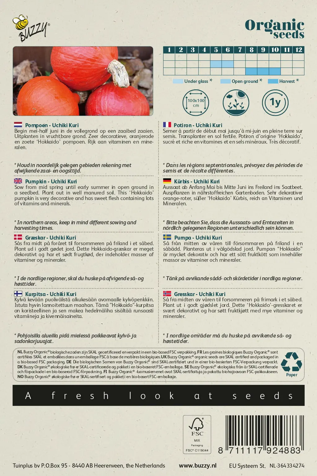 Begin mei-half juni in de vollegrond op een zaaibed zaaien. Uitplanten in vruchtbare grond. Zeer decoratieve, oranjerode en zoete ‘Hokkaido’ pompoen. Rijk aan vitaminen en mineralen.