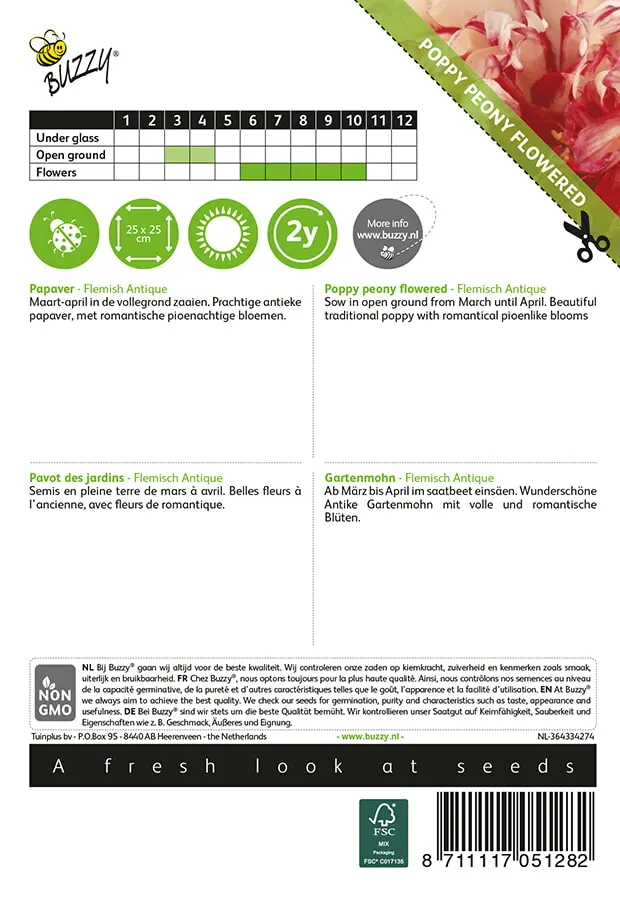 Maart-april in de vollegrond zaaien. Prachtige antieke papaver met romantische pioenachtige bloemen.