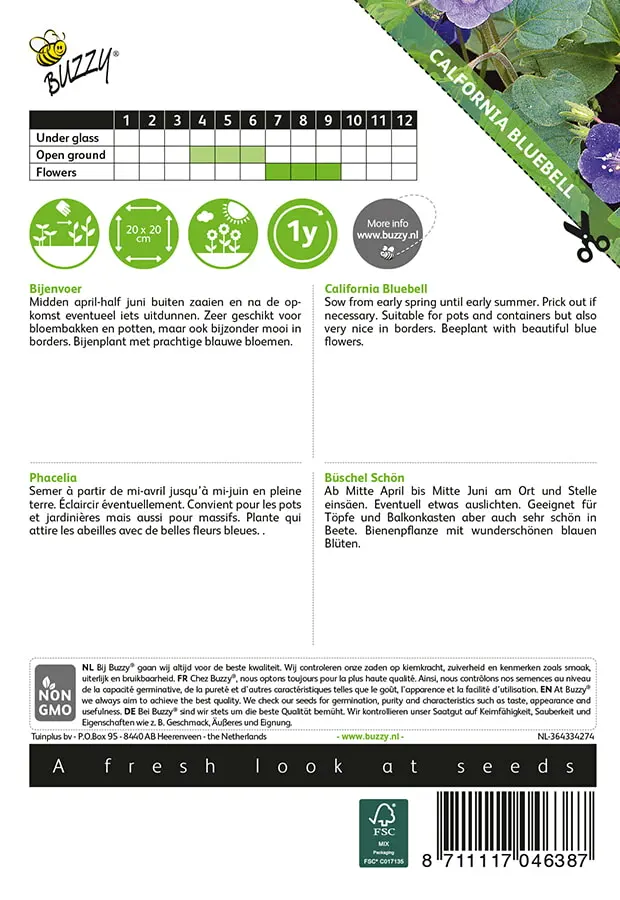 Midden april-half juni buiten zaaien en na de opkomst eventueel iets uitdunnen. Zeer geschikt voor bloembakken en potten, maar ook bijzonder mooi in borders. Bijenplant met prachtige blauwe bloemen.