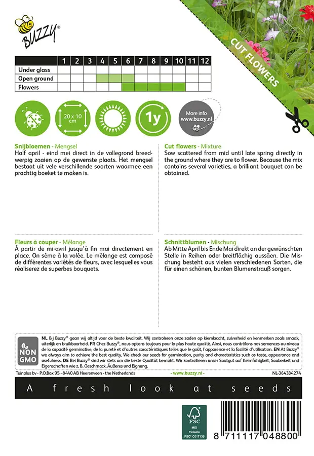 Half april-eind mei direct in de vollegrond breedwerpig zaaien op de gewenste plaats. Het mengsel bestaat uit vele verschillende soorten waarmee een prachtig boeket te maken is.