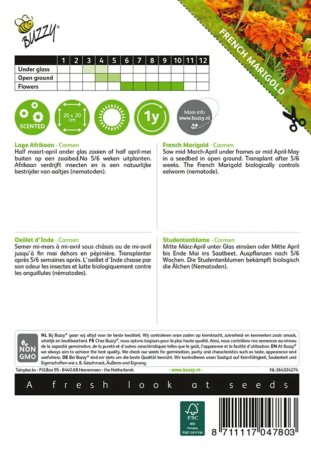 Half maart-april onder glas zaaien of half april-mei buiten op een zaaibed. Na 5/6 weken uitplanten. Afrikaan verdrijft insecten en is een natuurlijke bestrijder van aaltjes (nematoden).