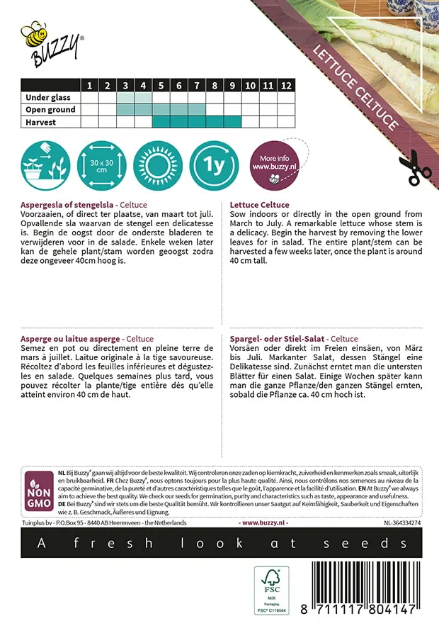 Voorzaaien, of direct ter plaatse, van maart tot juli. Opvallende sla waarvan de stengel een delicatesse is. Begin de oogst door de onderste bladeren te verwijderen voor in de salade. Enkele weken later kan de gehele plant/stam worden geoogst zodra deze ongeveer 40cm hoog is.