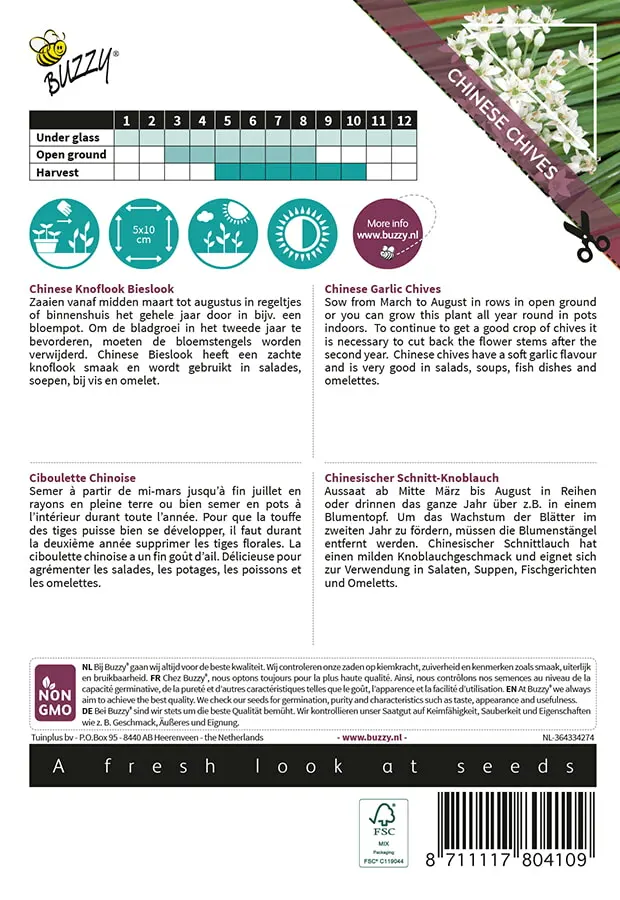 Chinese Bieslook heeft een zachte knoflook smaak en wordt gebruikt in salades, soepen, bij vis en omelet.