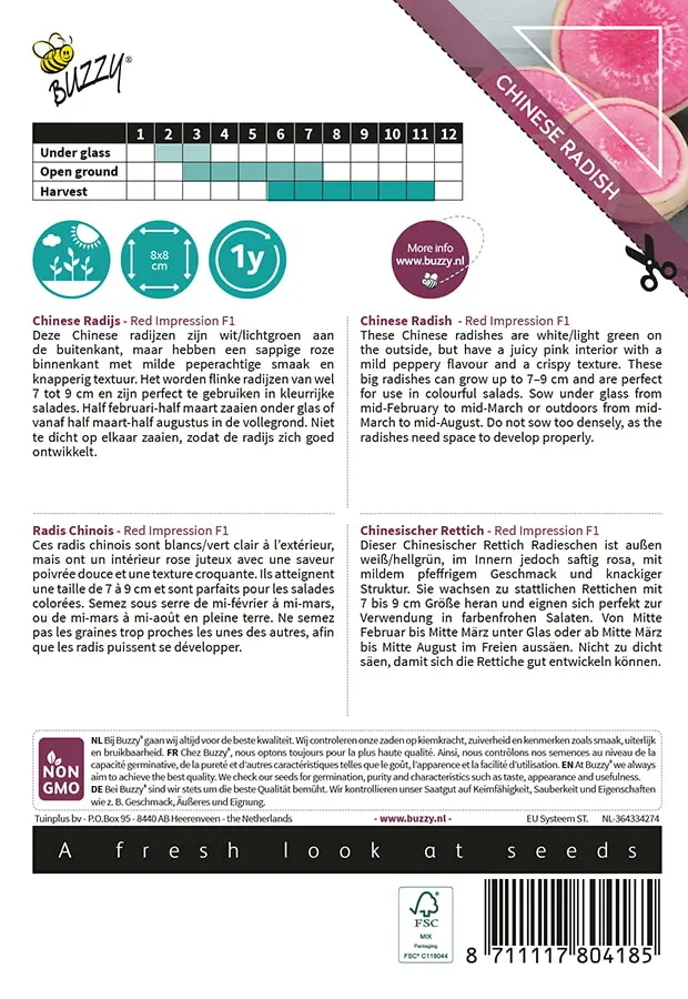 Deze Chinese radijzen zijn wit/lichtgroen aan de buitenkant, maar hebben een sappige roze binnenkant met milde peperachtige smaak en knapperig textuur. Het worden flinke radijzen van wel 7 tot 9 cm en zijn perfect te gebruiken in kleurrijke salades. _x000D_