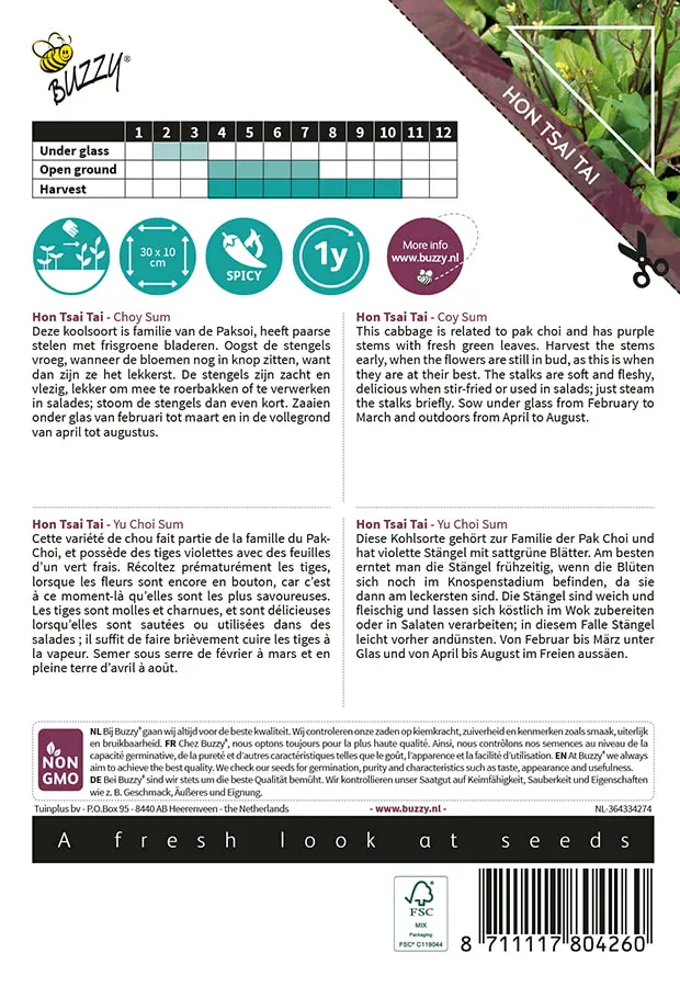 Deze koolsoort is familie van de Paksoi, heeft paarse stelen met frisgroene bladeren. Oogst de stengels vroeg, wanneer de bloemen nog in knop zitten, want dan zijn ze het lekkerst. De stengels zijn zacht en vlezig, lekker om mee te roerbakken of te verwerken in salades; stoom de stengels dan even kort. Zaaien onder glas van februari tot maart en in de vollegrond van april tot augustus.