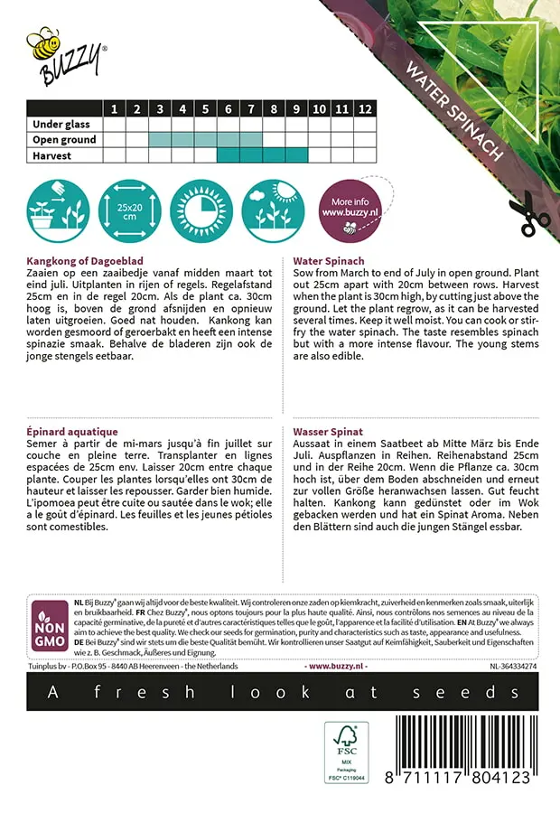 Zaaien op een zaaibedje vanaf midden maart tot eind juli. Uitplanten in rijen of regels. Regelafstand 25cm en in de regel 20cm. Als de plant ca. 30cm hoog is, boven de grond afsnijden en opnieuw laten uitgroeien. Goed nat houden. Kankong kan worden gesmoord of geroerbakt en heeft een intense spinazie smaak. Behalve de bladeren zijn ook de jonge stengels eetbaar.