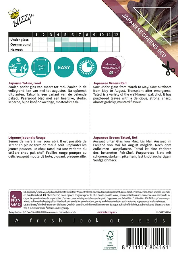 Tatsoi is een variant van de bekende paksoi. Paarsrood blad met een heerlijke, sterke, scherpe, bijna knoflookachtige, mosterdsmaak.