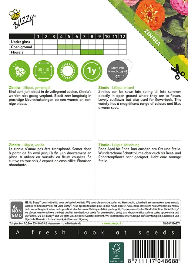 Eind april-juni direct in de vollegrond zaaien, Zinnia’s worden niet graag verplant. Bloeit zeer langdurig in prachtige kleurschakeringen op een warme en zonnige plaats.