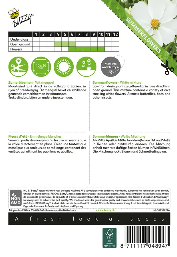Maart-eind juni direct in de vollegrond zaaien, in rijen of breedwerpig. Dit mengsel bevat verschillende geurende zomerbloemen in witnuances._x000D_