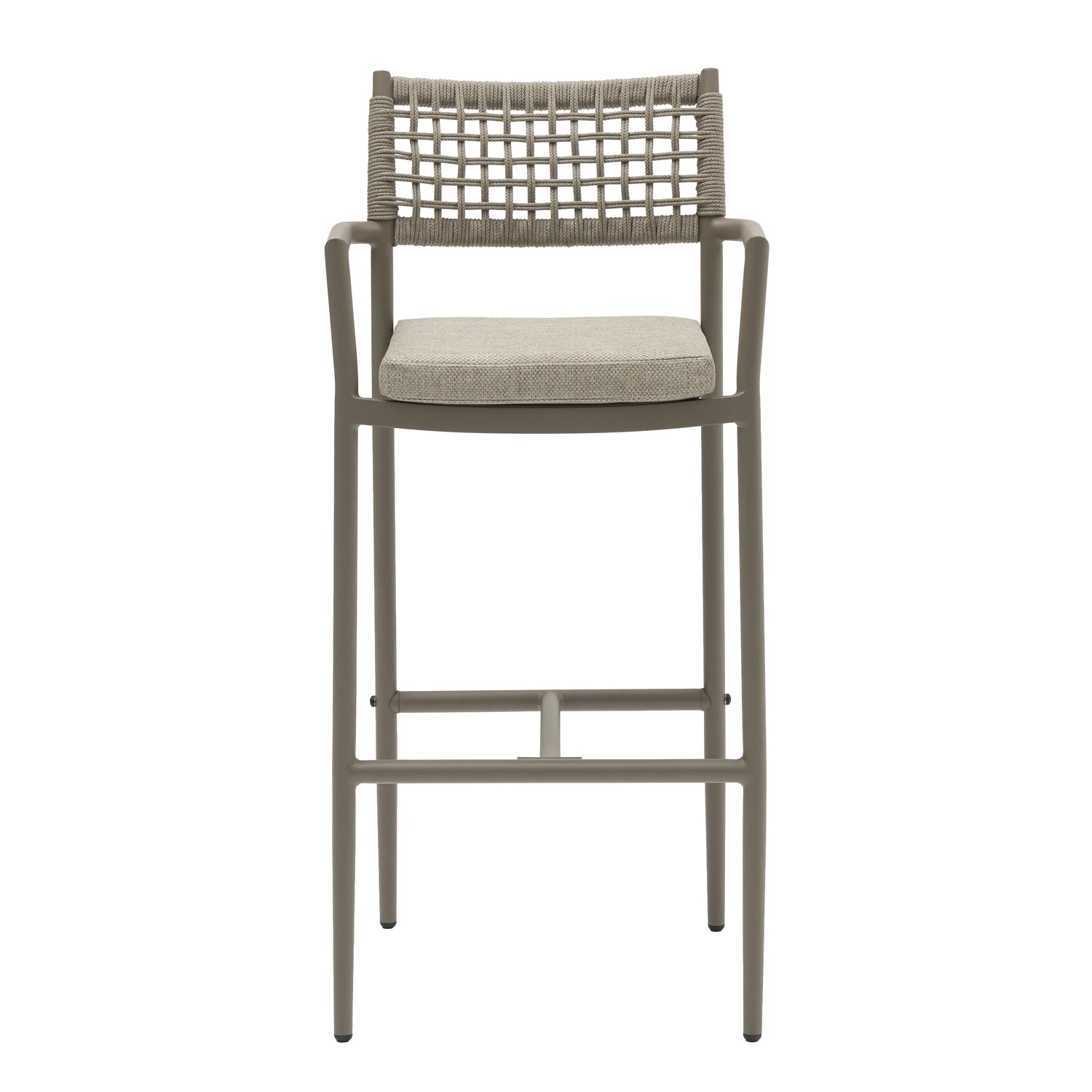 De Liv barstoel espresso van Ease up® combineert luxe uitstraling met praktisch comfort voor je terras of buitenbar. Het aluminium frame in espresso, de rugleuning van touw en het lichte polyester kussen zorgen voor een stijlvolle, uitnodigende uitstraling.