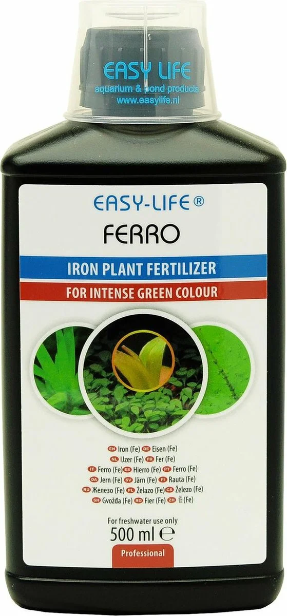 Easy-Life Ferro bevat gemakkelijk opneembaar ijzer voor waterplanten. IJzer is onmisbaar voor een goede opbouw van plantenbladeren. Het zorgt voor de “groene kleur” van het blad door de aanmaak van bladgroen.