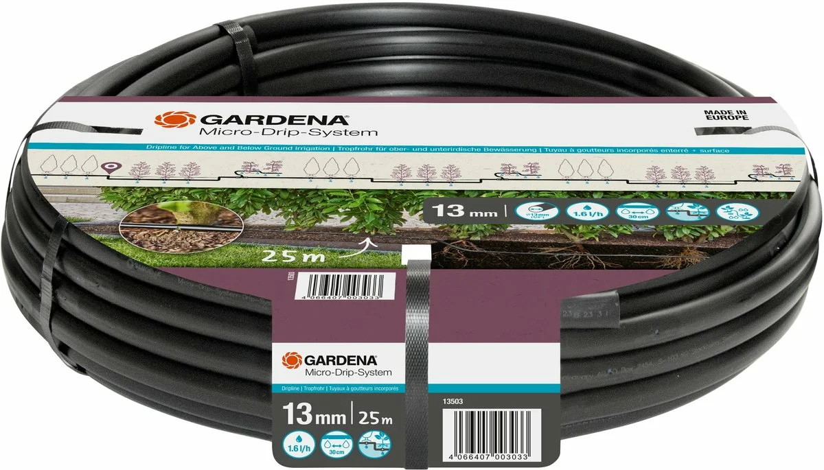 Gemakkelijk te installeren Gardena druppelbuis met geïntegreerde druppelaars voor een waterbesparende druppelbewatering van plantenrijen tot 25 meter lang, zoals heggen, struiken en buxussen.