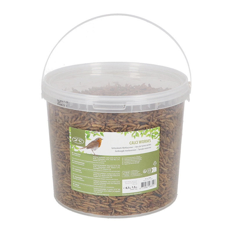 Gedroogde calciwormen van Esschert Design zijn een hoogwaardige voedingsbron voor de vogels in je tuin. Deze emmer van 0,7 kg bevat gedroogde calciwormen die rijk zijn aan calcium en eiwitten, essentiële voedingsstoffen die vogels nodig hebben voor een gezonde ontwikkeling. De calciwormen zijn een natuurlijke lekkernij die het hele jaar door kan worden aangeboden aan verschillende vogelsoorten, waardoor je tuin een levendige ontmoetingsplaats wordt voor gevleugelde bezoekers.