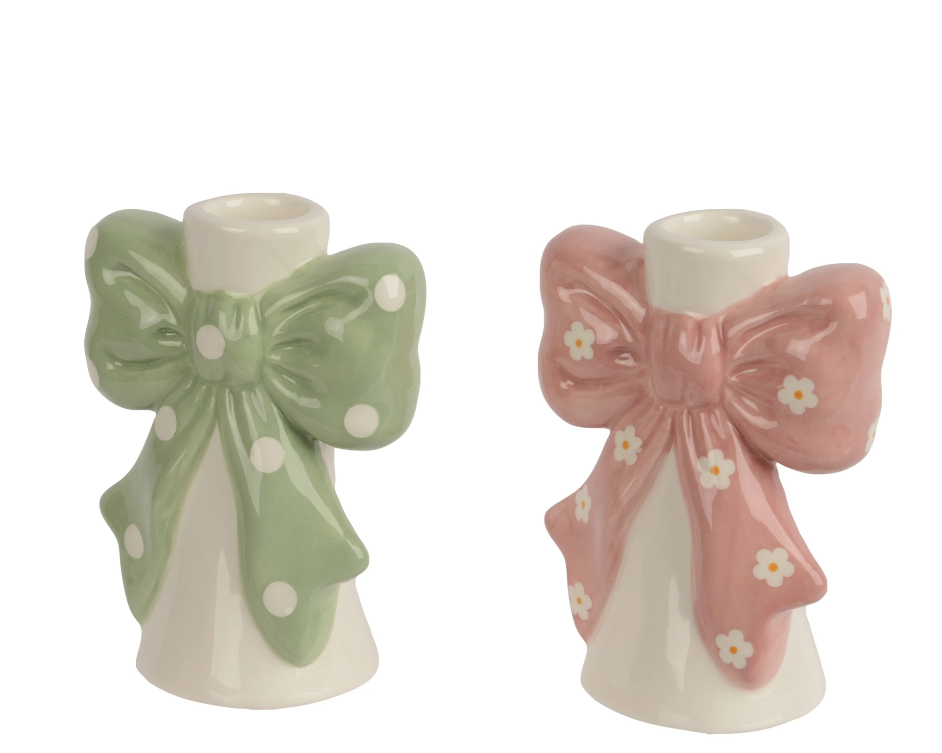 Breng een speelse en levendige sfeer in je interieur met deze handgemaakte kaarshouders van Decoris. Deze unieke set bestaat uit twee kaarshouders, elk met een charmante strik in zachte pasteltinten met bloemen- en stippenprints. Het gladde dolomietmateriaal geeft een subtiele glans die prachtig contrasteert met de kleurrijke details. Met een slank en elegant silhouet passen ze perfect op een dressoir, coffee tafel of vensterbank en geven ze een artistiek accent aan je woonruimte.