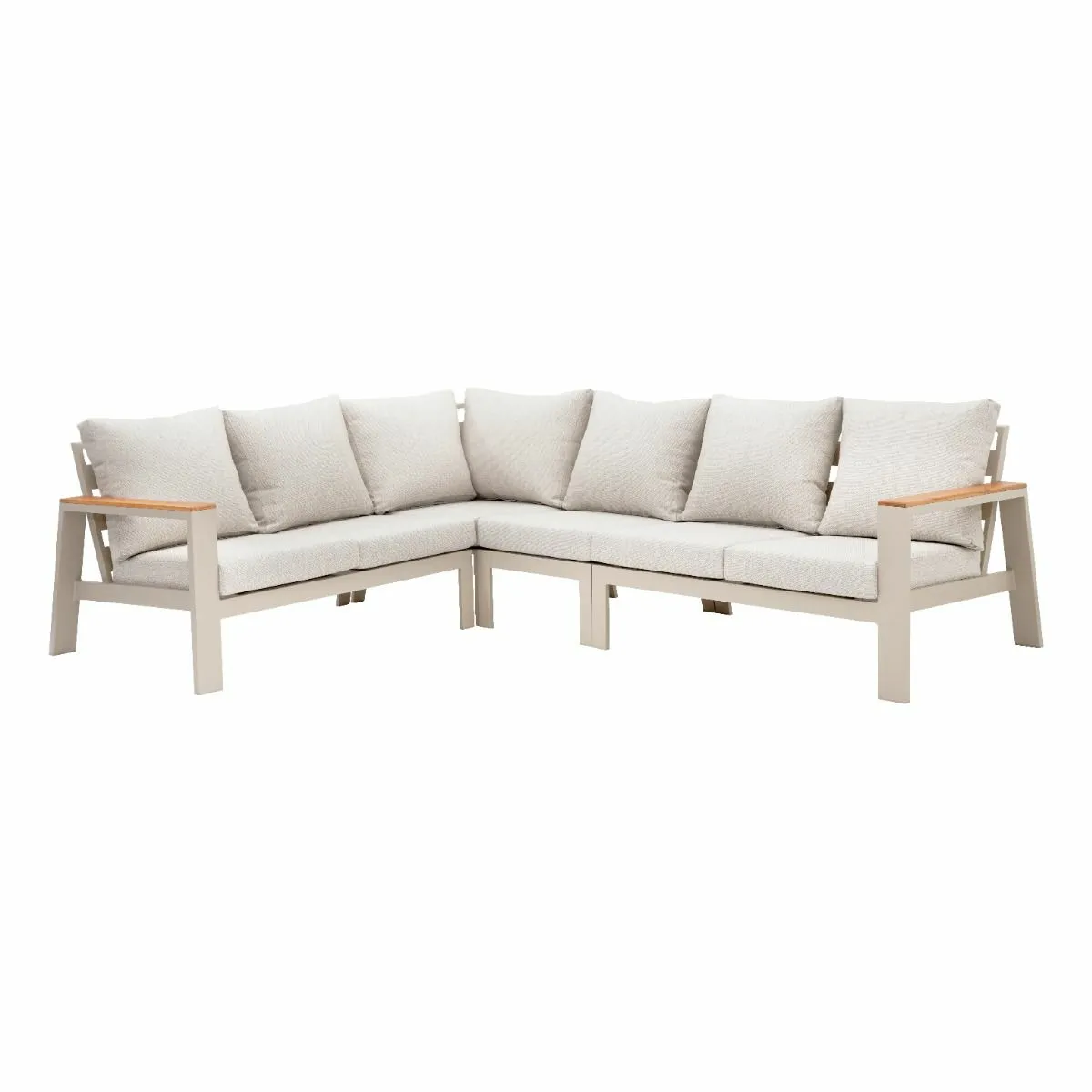 Het beige aluminium frame met teakhouten afwerking op de leuningen geeft de Laos hoeklounge een tijdloze uitstraling. De bank is perfect te combineren met andere meubels uit de Laos serie van Royal Seasons. De Sunproof® kussens in beige voegen niet alleen comfort toe, maar bieden ook bescherming tegen UV-stralen en ze zijn waterbestendig.