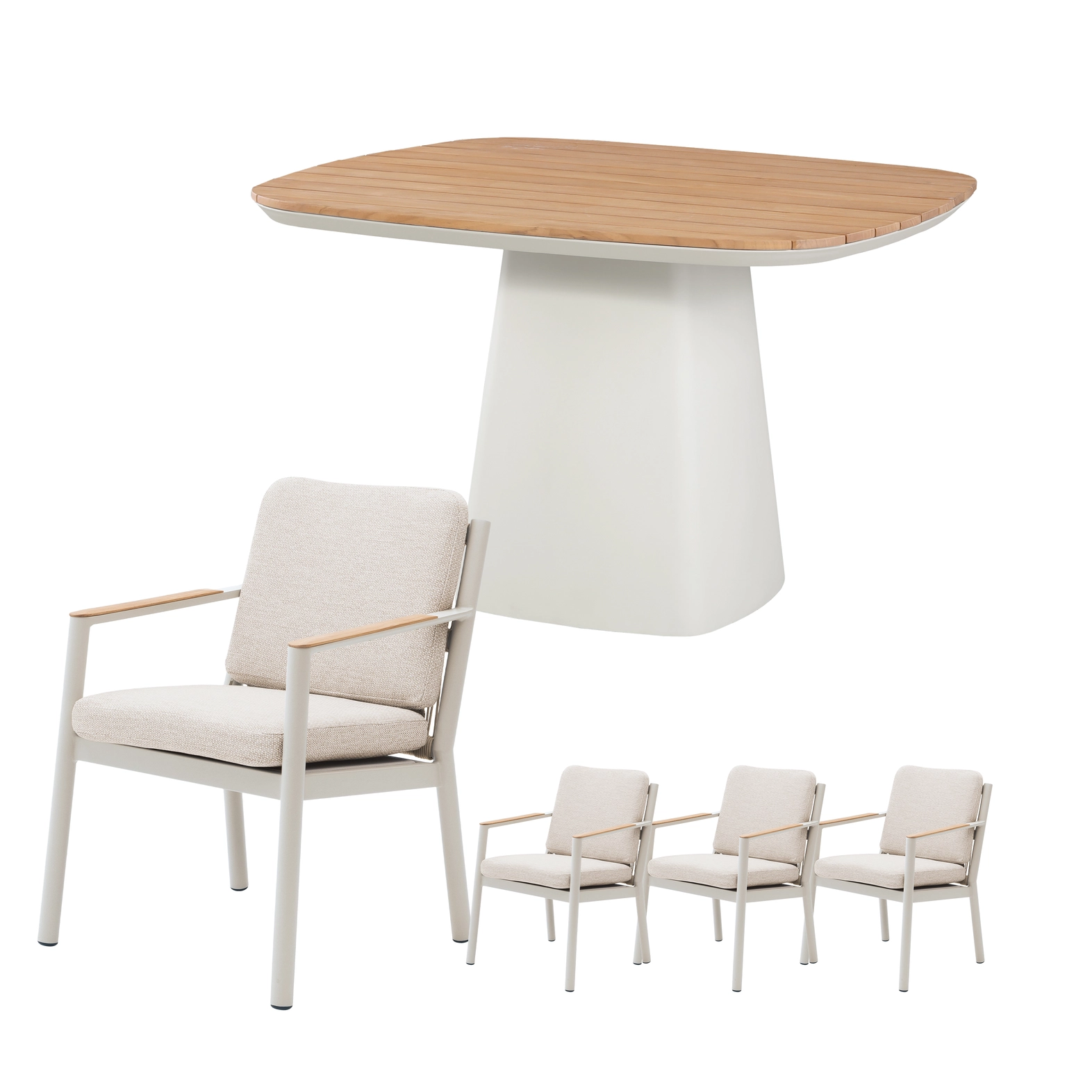De Royal Seasons® Marina tafel 120 x 120 x H75cm zand teak combineert elegantie met functionaliteit en is een ideale keuze voor diners en sociale bijeenkomsten buitenshuis. Het frame is gemaakt van hoogwaardig aluminium, wat zorgt voor een stevige basis, terwijl het tafelblad van duurzaam teakhout een warme en natuurlijke uitstraling geeft. Met zijn compacte vierkante formaat past deze tafel perfect in kleinere buitenruimtes of als aanvulling op een bestaande set. Het zandkleurige frame heeft een trendy look die perfect past bij de hedendaagse tuinen.