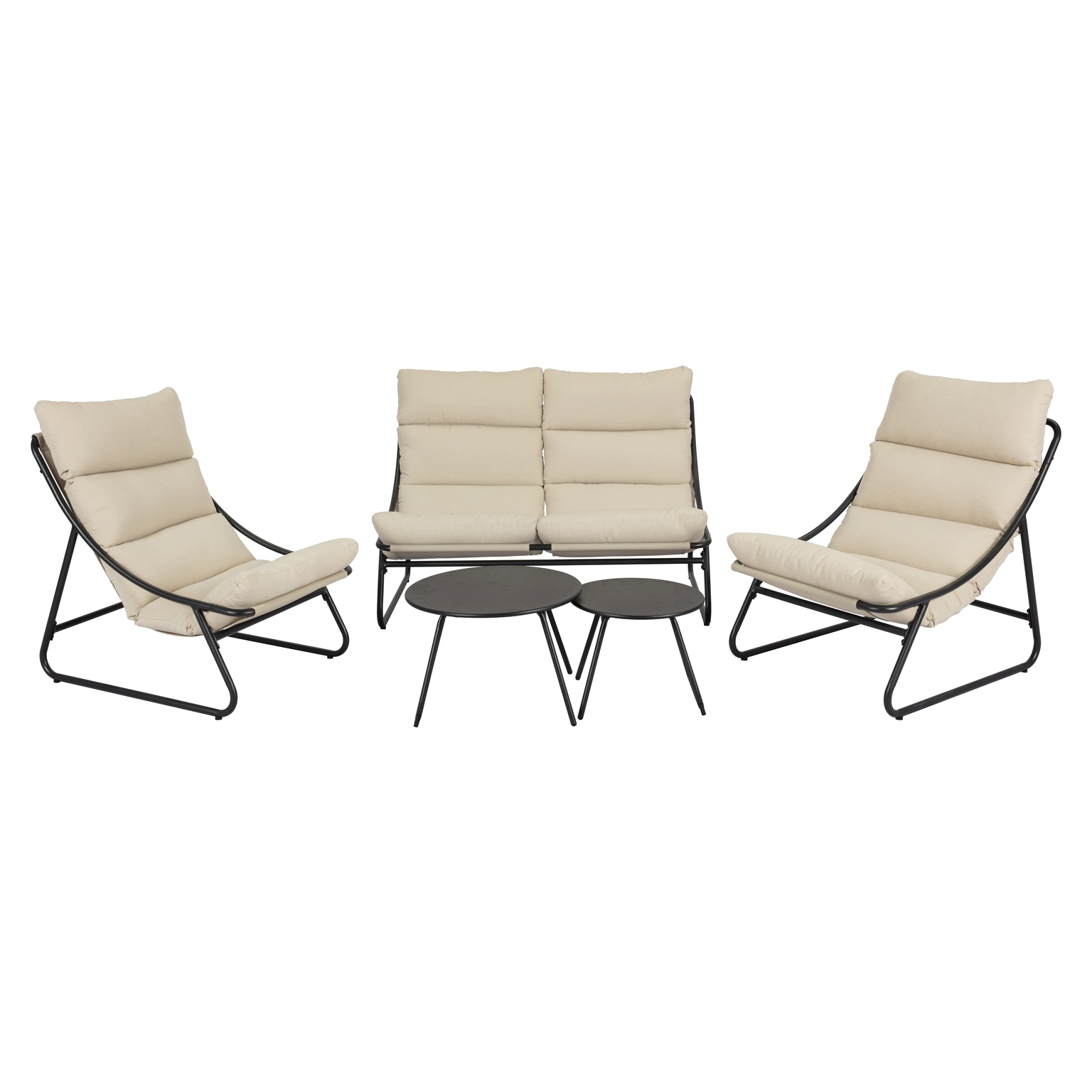 • Ruime opstelling met fauteuils (B 70 x D 95 x H 89 cm), een 2-zitsbank (B 134.5 x D 95 x H 89 cm) en twee bijzettafels (D 60 x H 40 cm en D 46 x H 34,5 cm).