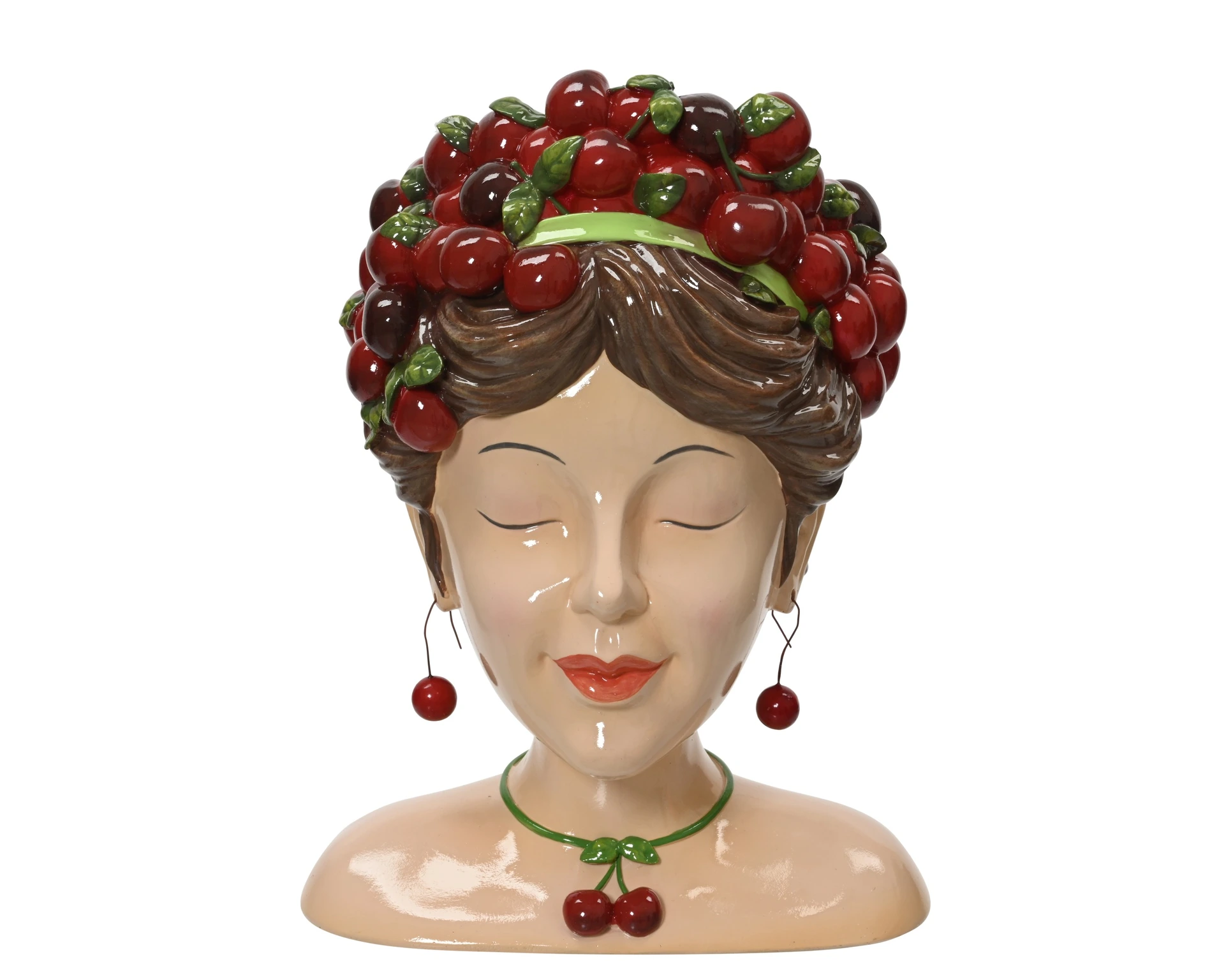 Voeg een speelse en warme touch toe aan je interieur met deze unieke bloempot van Decoris. Het opvallende ontwerp in de vorm van een vrouwenhoofd, gekroond met glanzende rode cherries, is gegarandeerd een vrolijke blikvanger. Dit handgemaakte polyresin kunstwerk brengt levendigheid en stijl in elke ruimte. Dankzij het waterafstotende oppervlak behoudt de bloempot zijn levendige kleuren en afwerking.