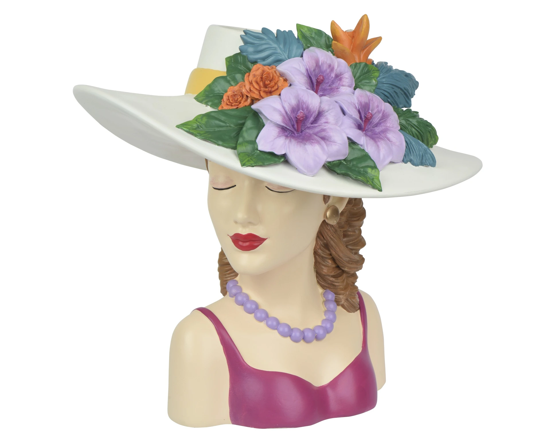 Breng een speelse en kleurrijke twist in je interieur met deze opvallende bloempot van Decoris. De bloempot is gevormd als een vrouwelijk hoofd met een elegante hoed, rijkelijk versierd met roze en paars bloemen die direct in het oog springen. Gemaakt van stevig polyresin en met de hand afgewerkt, straalt dit unieke kunstwerk charme en creativiteit uit. Dankzij het compact formaat en het opvallende ontwerp is deze roze bloempot een echte blikvanger in elk modern interieur.